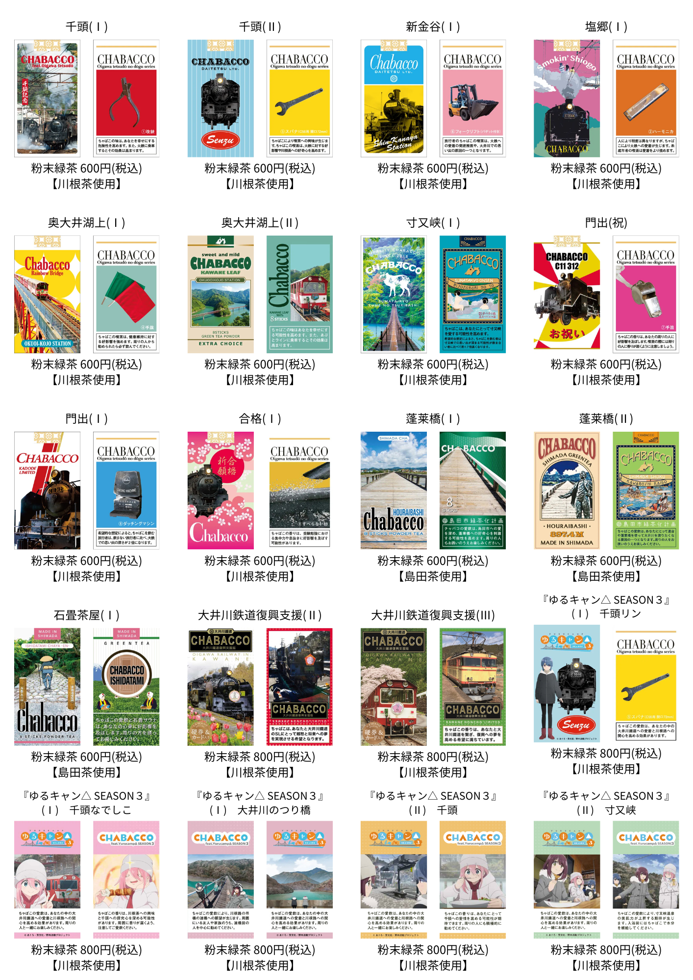 Chabaccoの定番商品は、SL機関車や夢のつり橋、寸又峡など、川根本町ならではのデザインが描かれています。